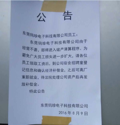 公告原文如下: 東莞鎢珍電子科技有限公司由于經(jīng)營(yíng)不善,即將進(jìn)入破產(chǎn)清算程序。為避免廣大員工損失進(jìn)一步擴(kuò)大,請(qǐng)各位員工領(lǐng)取工資后,到公司宿舍招聘室登記信息和確認(rèn)經(jīng)濟(jì)補(bǔ)償金,之后可離廠重新就業(yè),待法院處理公司資產(chǎn)后再發(fā)放補(bǔ)償金。